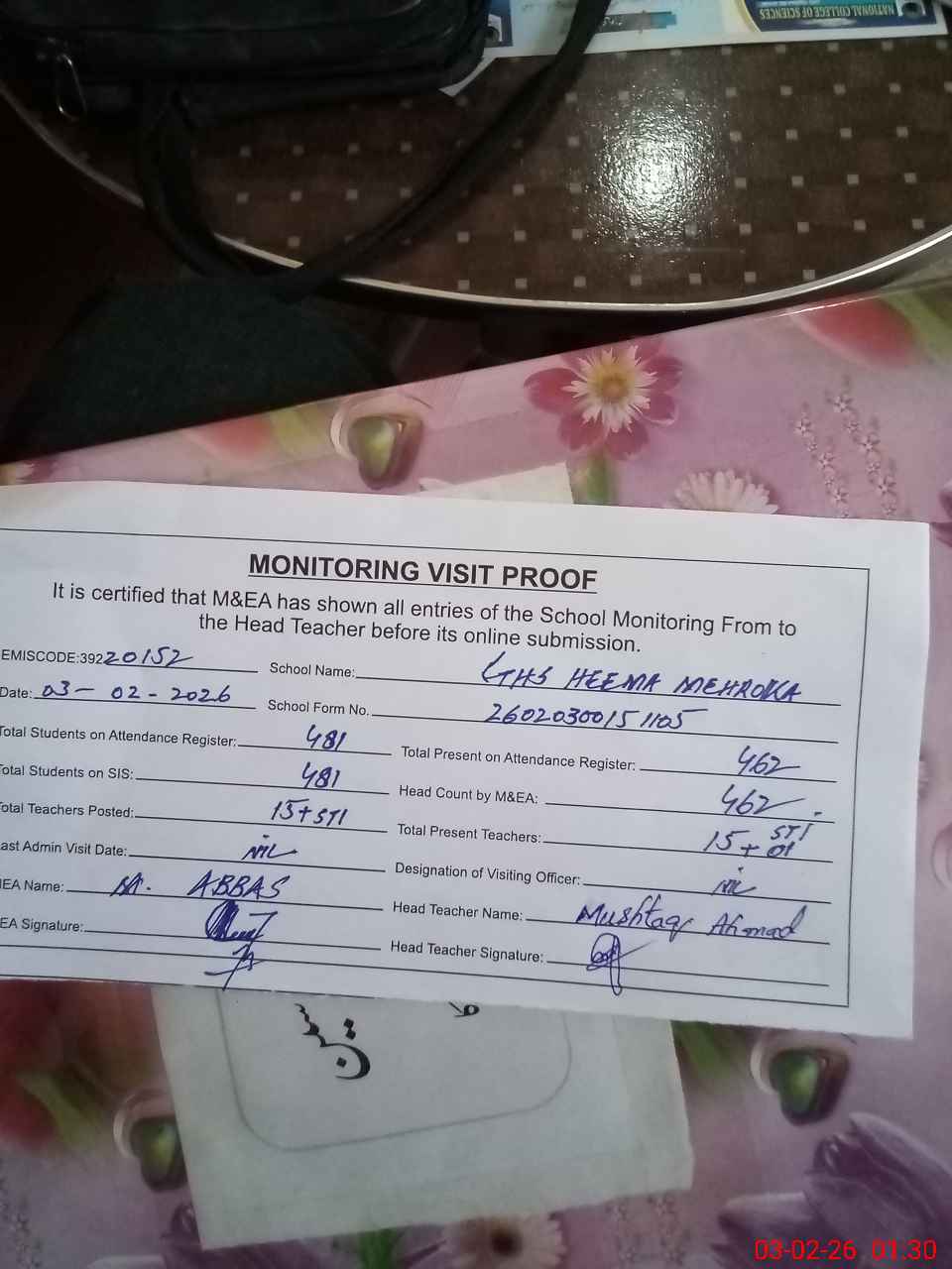 | Attendance Register | Head Teacher | MEA with School | Visit Proof |