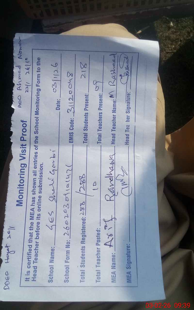 | Attendance Register | Head Teacher | MEA with School | Visit Proof |