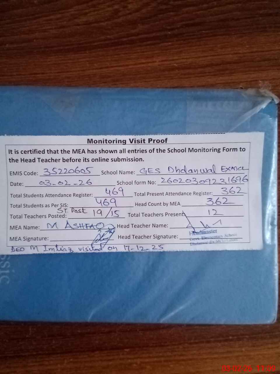| Remarks (Use Separate Page if Required): ESE Hafiz Abdul Rahman transfered since 13-04-2023 but his name still shown on SIS PST Sangeeta Bashir applied Medical leave but her still waiting for approval from DEO so mark him absent 24-11-2025 Sweeper Imran Masih long absent since 21-10-2025 DEO Muhammad Imtiaz Awan visited on 17-12-2025 NSB and FTF registers not shown ,35220605 | |||||