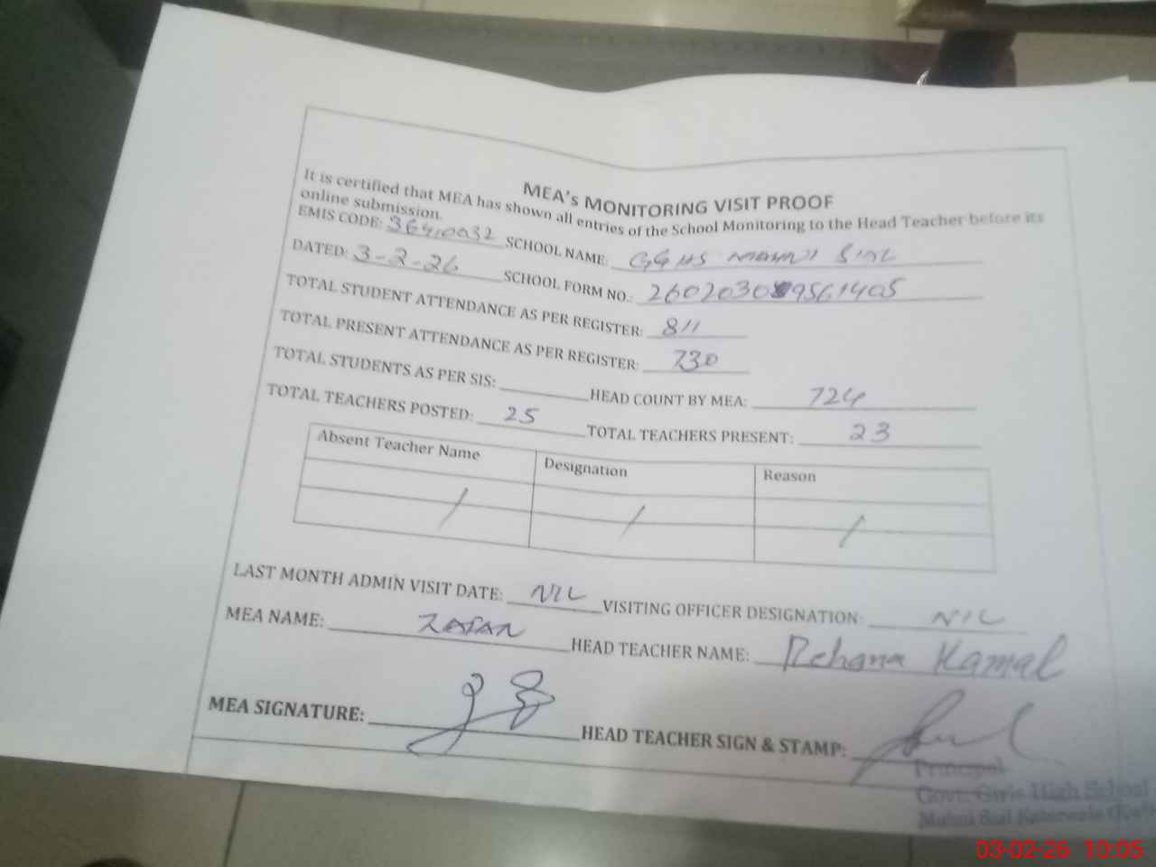 | Attendance Register | Head Teacher | MEA with School | Visit Proof |
