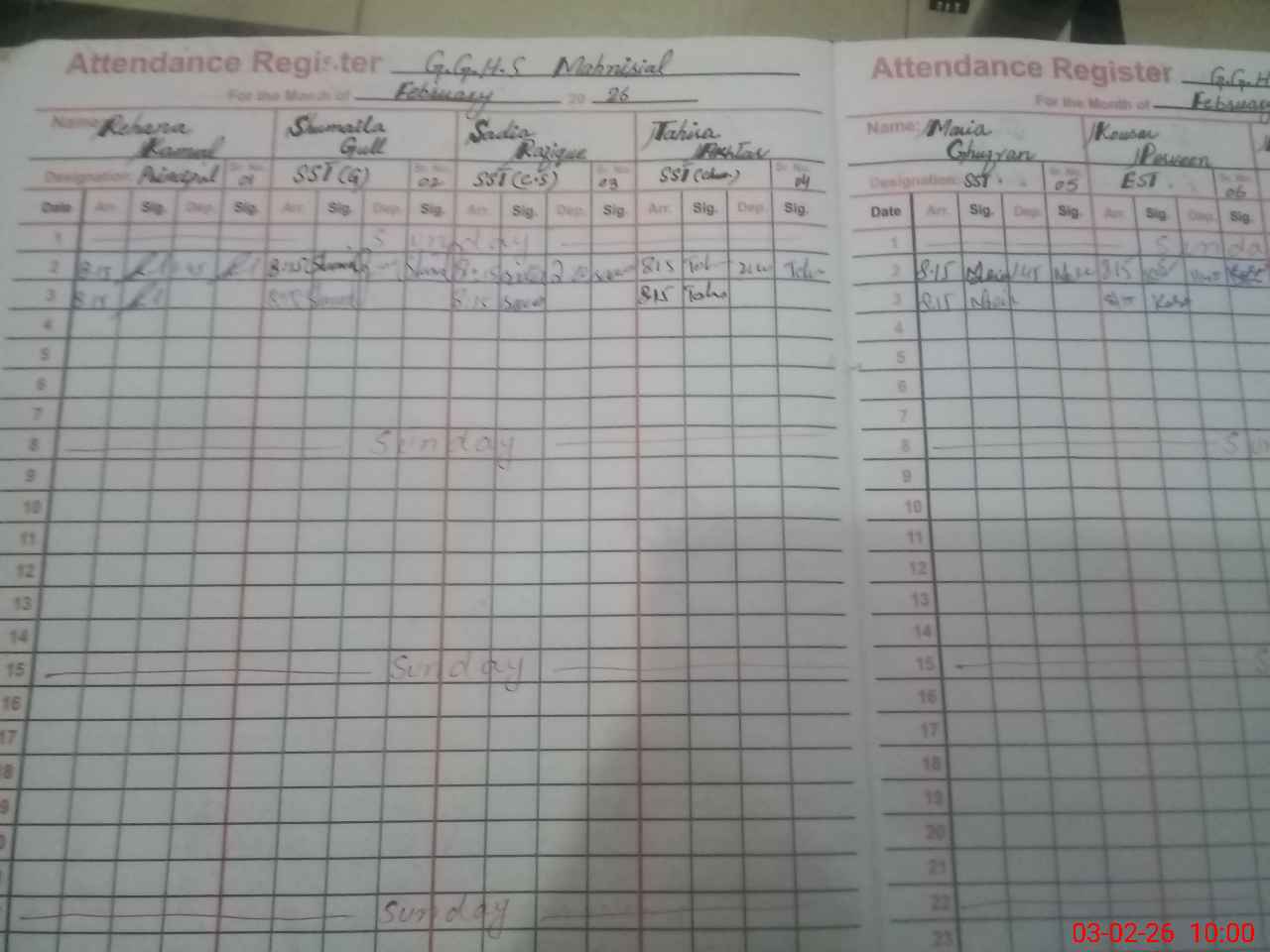 | School Visited by School Health & Nutrition Supervisor (No. of Visits) | Name1: | Masooda Bibi | Name2: | ||