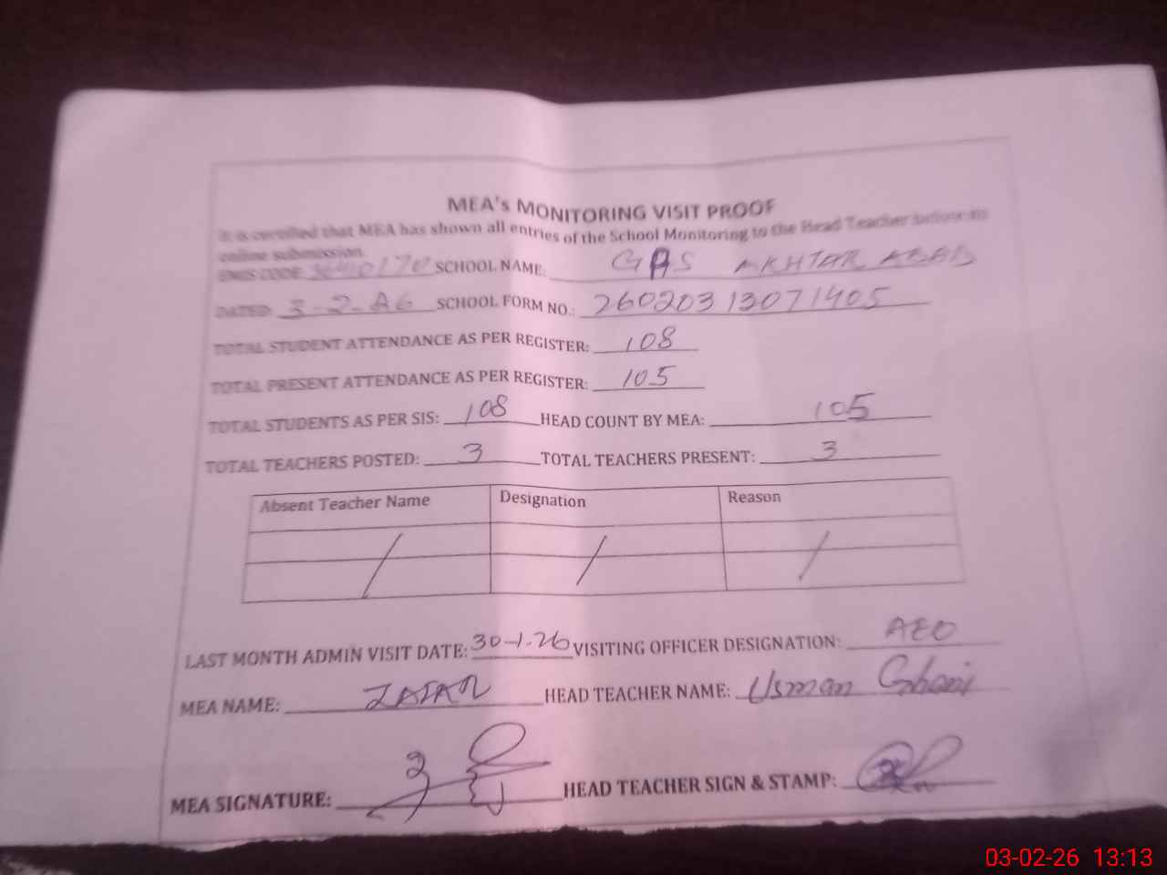| Attendance Register | Head Teacher | MEA with School | Visit Proof |