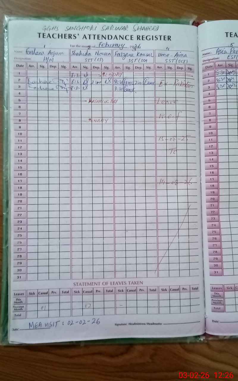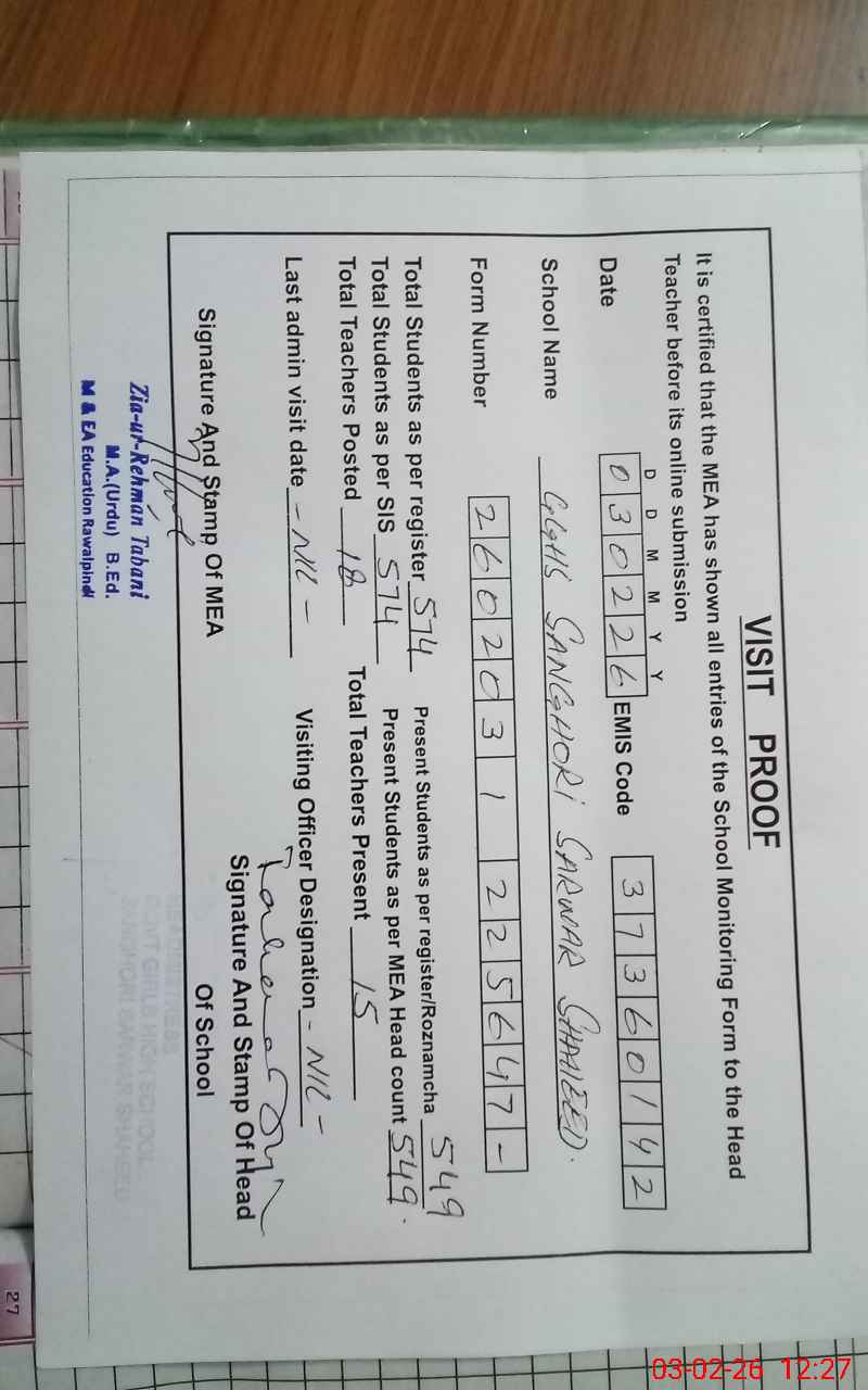 | EMIS Code: 37360142 | Name of School: GGHS SANGHORI SARWAR SHAHEED | |||