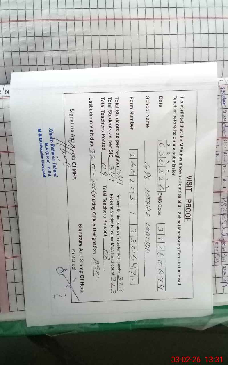 | Attendance Register | Head Teacher | MEA with School | Visit Proof |