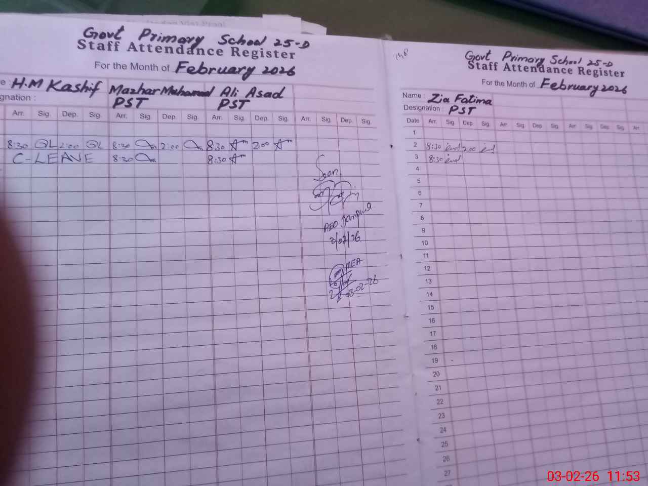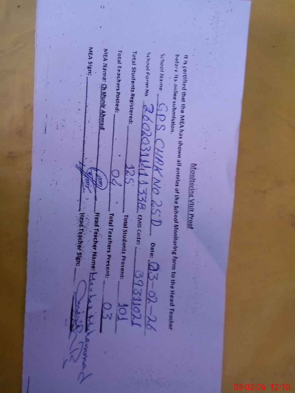 | Attendance Register | Head Teacher | MEA with School | Visit Proof |