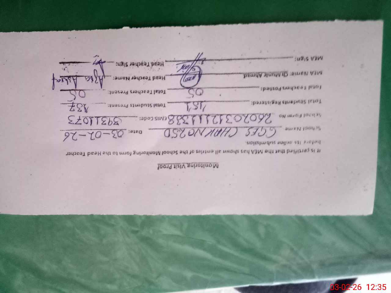 | Attendance Register | Head Teacher | MEA with School | Visit Proof |