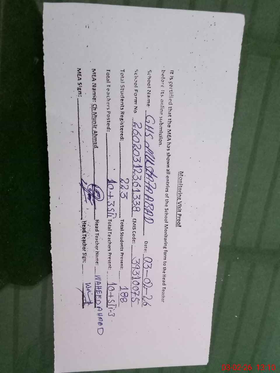| Certified that this School was Inspected by the Undersigned MEA/DMO Today and the Information Stated Above is as Per Record. | |||||