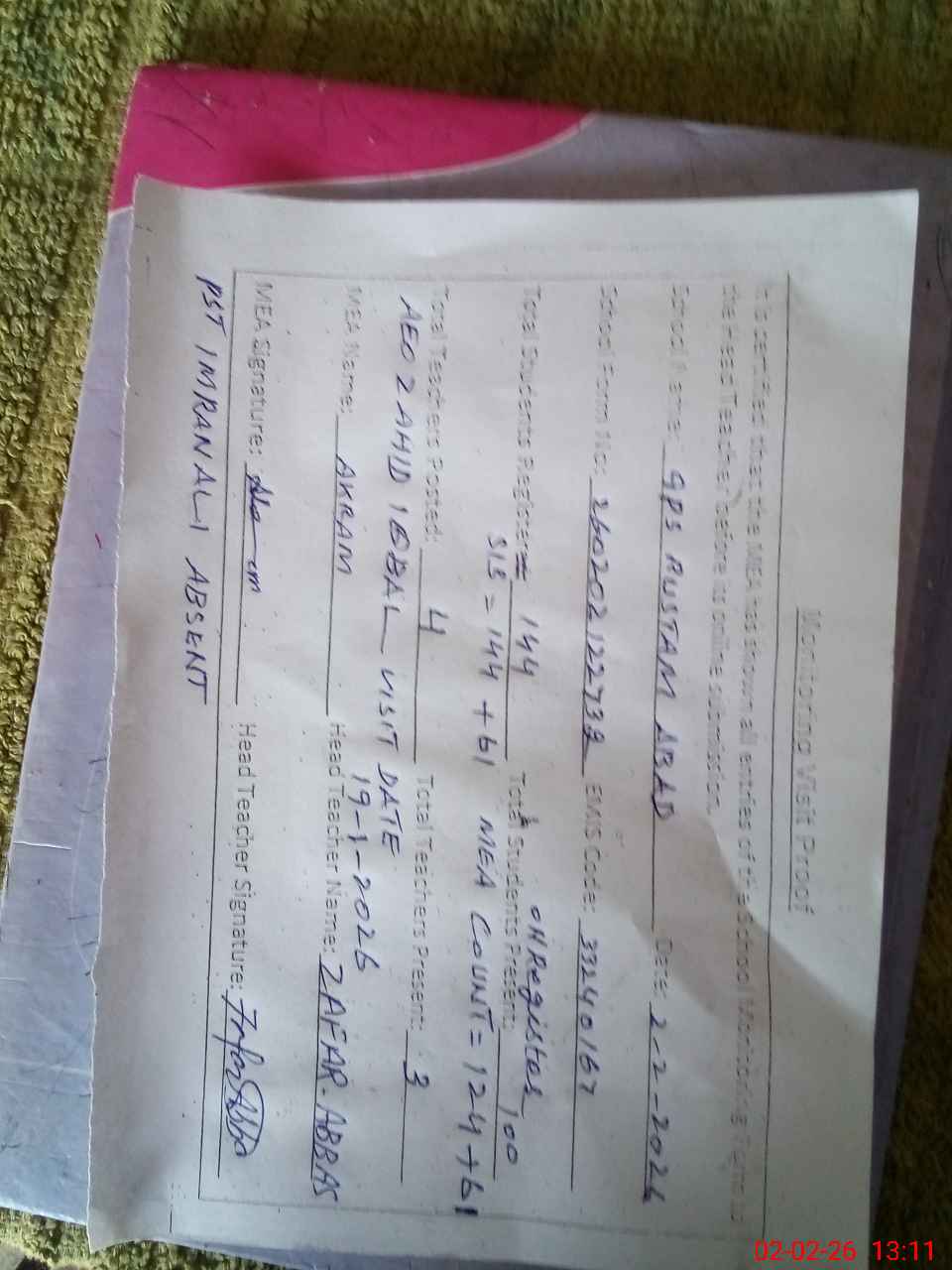 | Attendance Register | Head Teacher | MEA with School | Visit Proof |