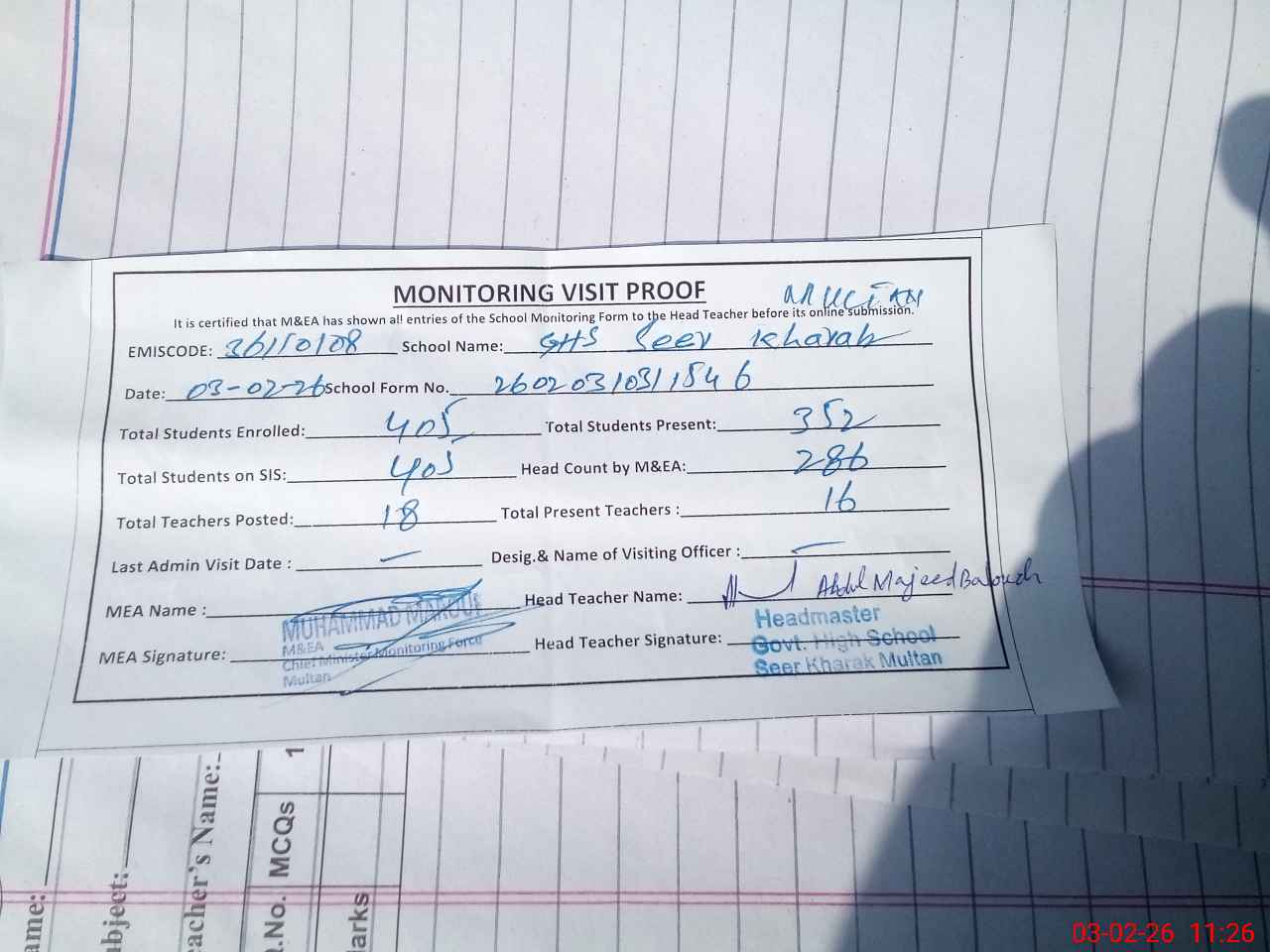 | Monitoring Date: 03-02-2026 | Start Time: 03-02-2026 10:30 AM | End Time: 03-02-2026 11:27 AM | Name of MEA: Mu**** Ma**** | |