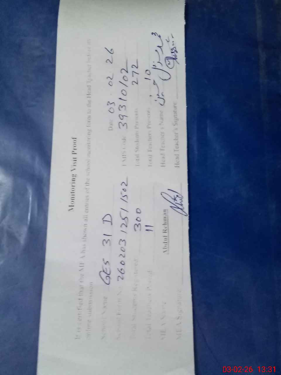 | Attendance Register | Head Teacher | MEA with School | Visit Proof |