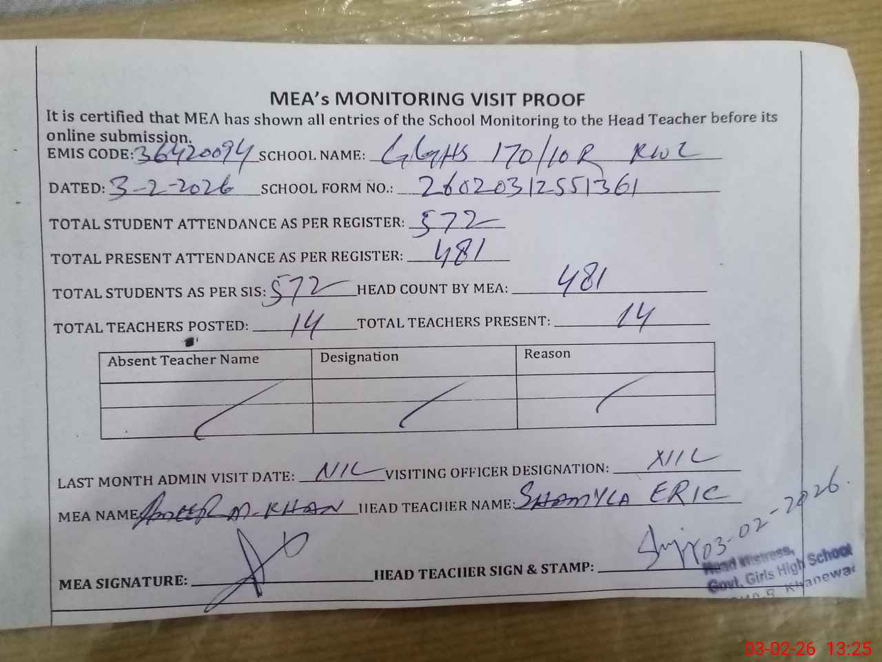 | EMIS Code: 36420094 | Name of School: GGHS 170/10-R, KHANEWAL | |||