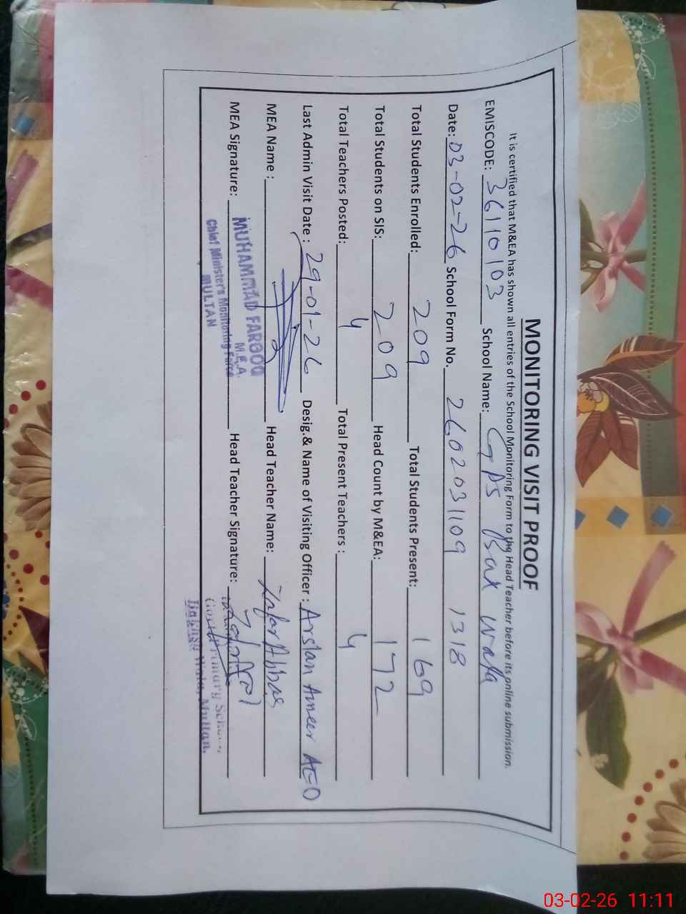 | EMIS Code: 36110103 | Name of School: GPS BAKHSH WALA SURAJ MIANI MULTAN | |||