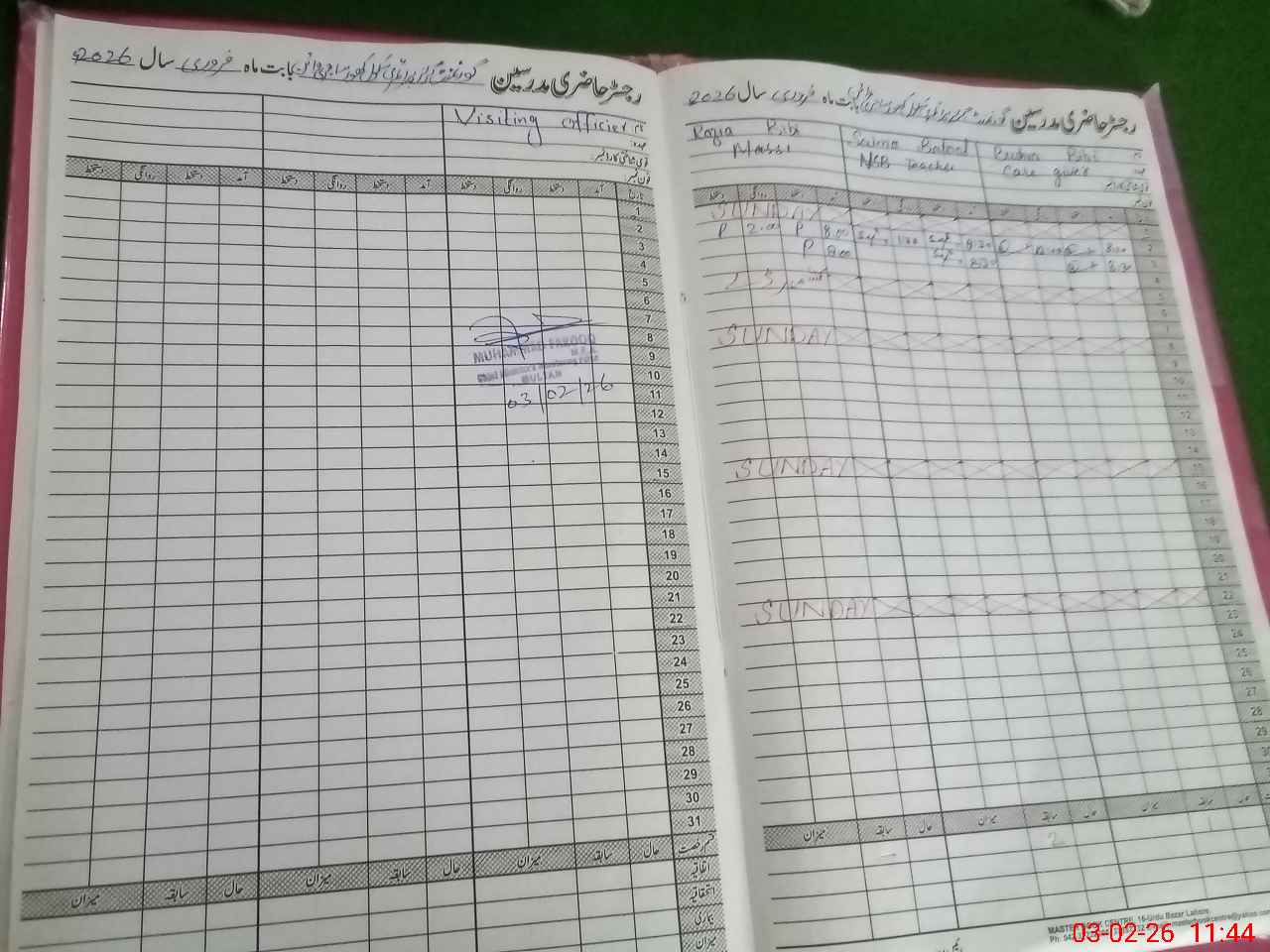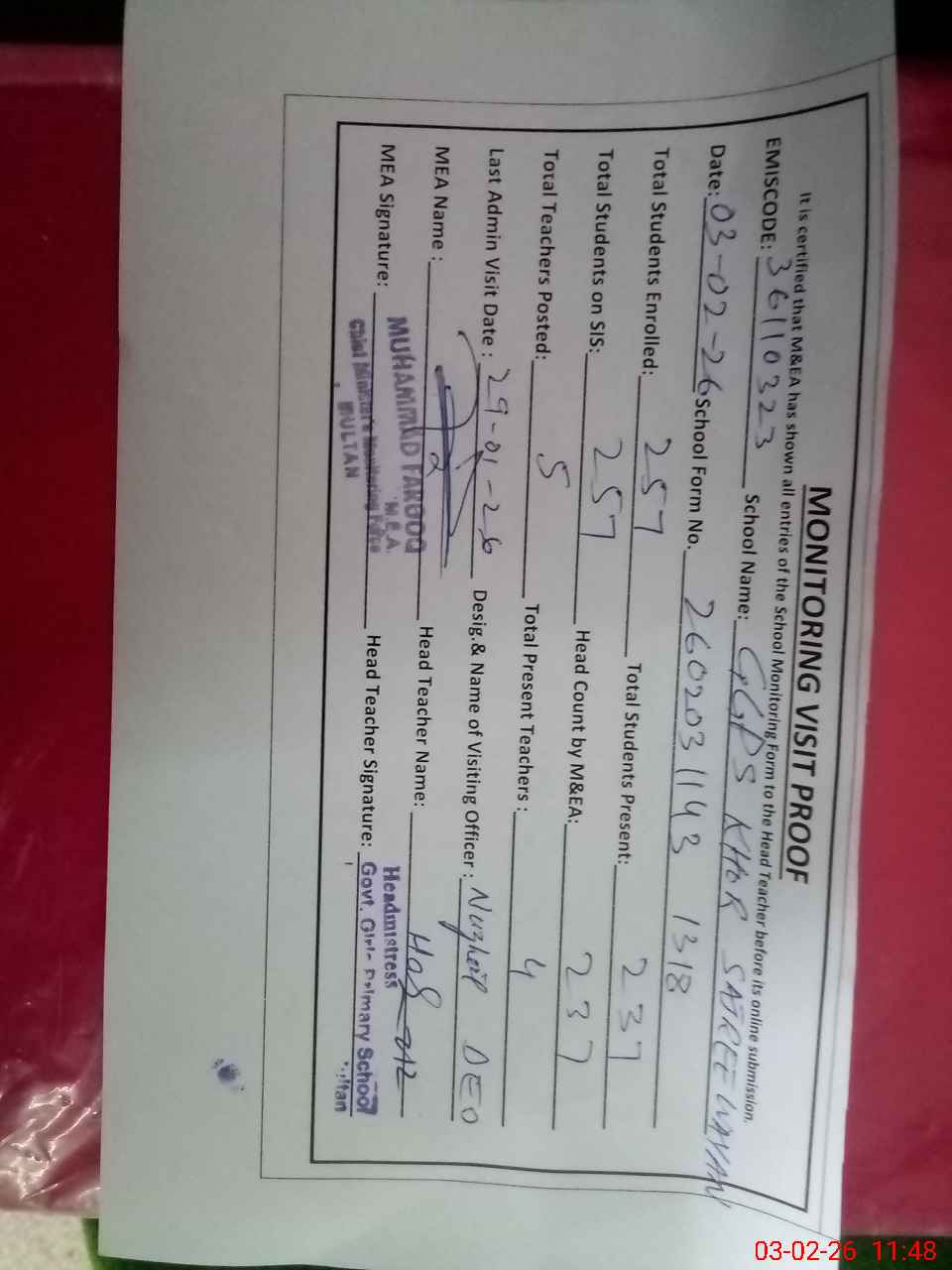 | Attendance Register | Head Teacher | MEA with School | Visit Proof |