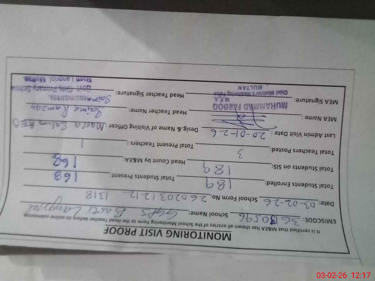 | EMIS Code: 36130596 | Name of School: GGPS BASTI LANGRIYAL MULTAN | |||