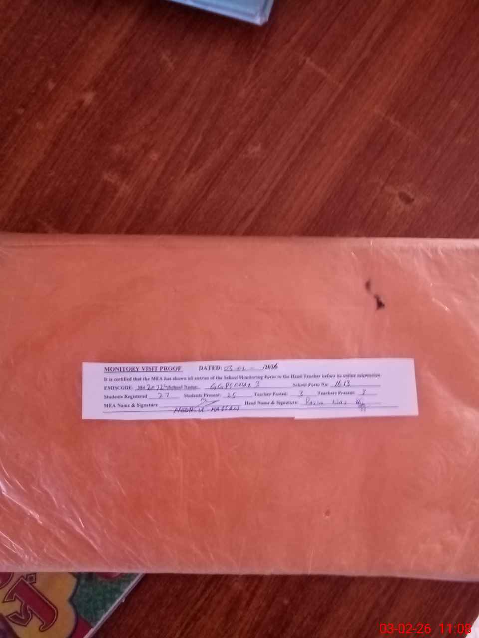 | Attendance Register | Head Teacher | MEA with School | Visit Proof |