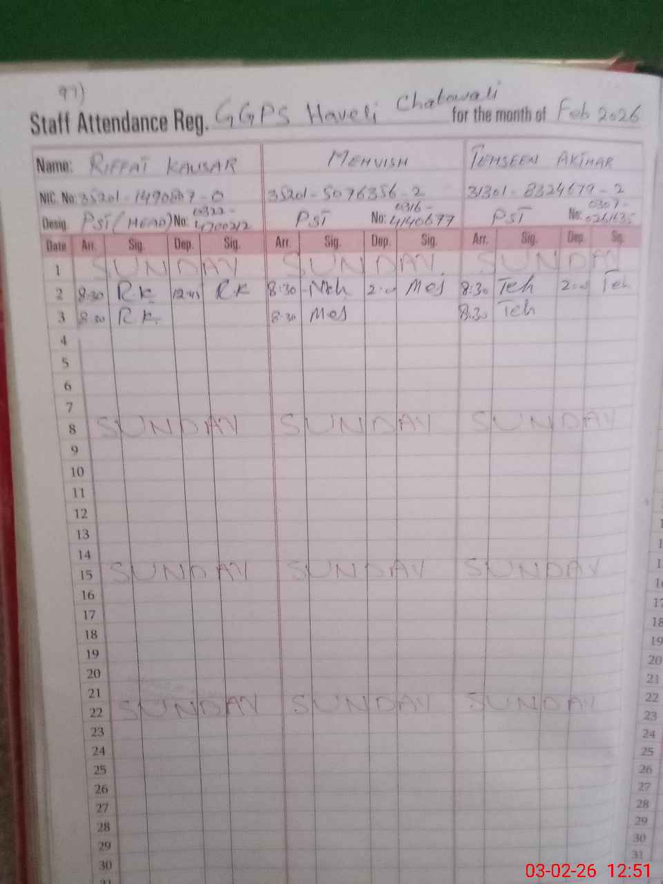 | CNIC | Full Name | Designation | R/C | Absence During Last Calender Month |