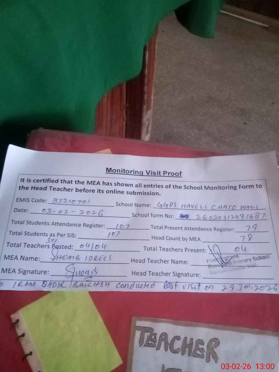 | Attendance Register | Head Teacher | MEA with School | Visit Proof |