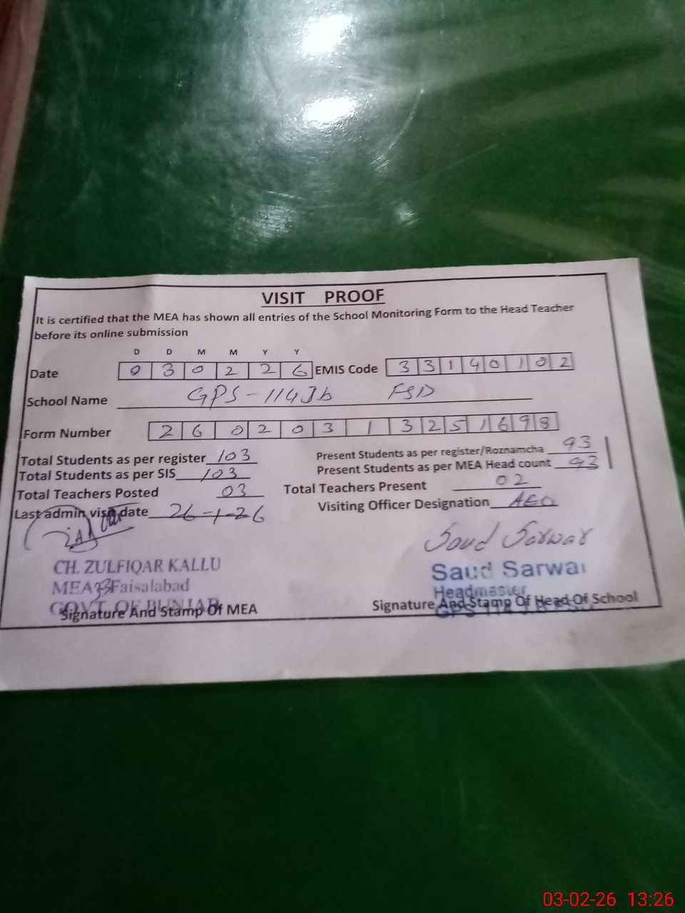 | EMIS Code: 33140102 | Name of School: GPS CHAK 114 JB FSD | |||