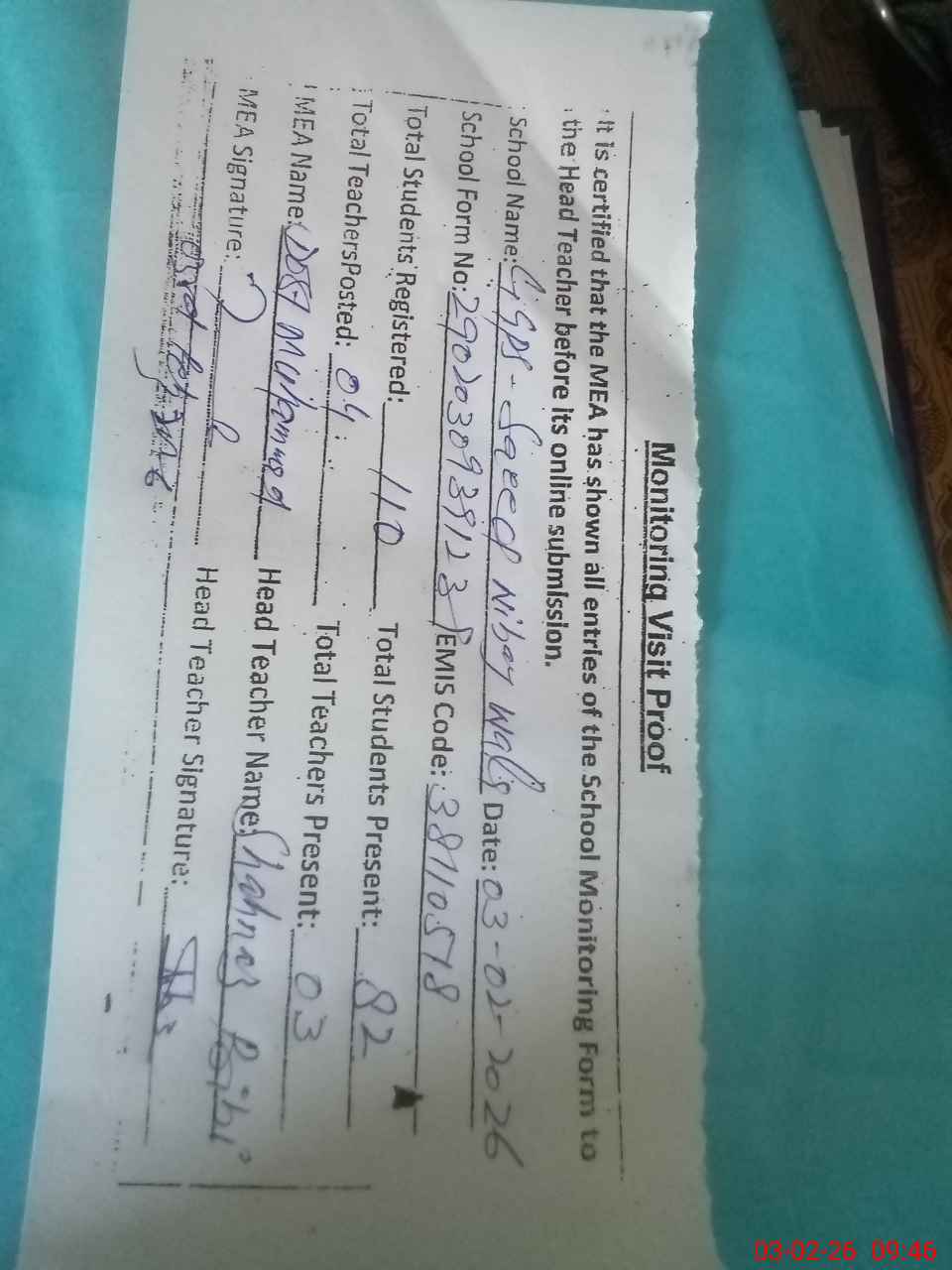 | Remarks (Use Separate Page if Required): All the entered data loudly share with the head teacher before submitting | |||||