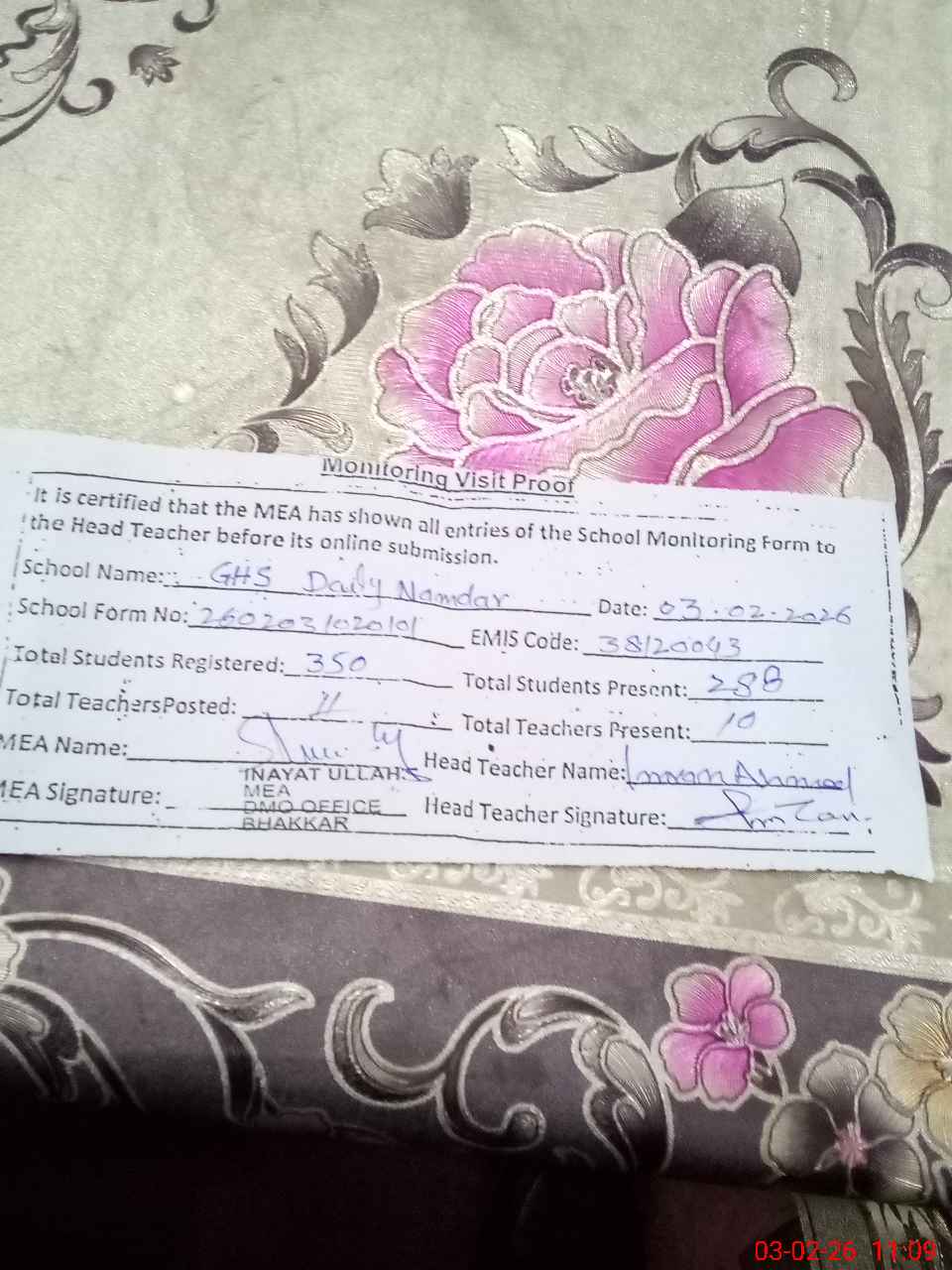 | Certified that this School was Inspected by the Undersigned MEA/DMO Today and the Information Stated Above is as Per Record. | |||||