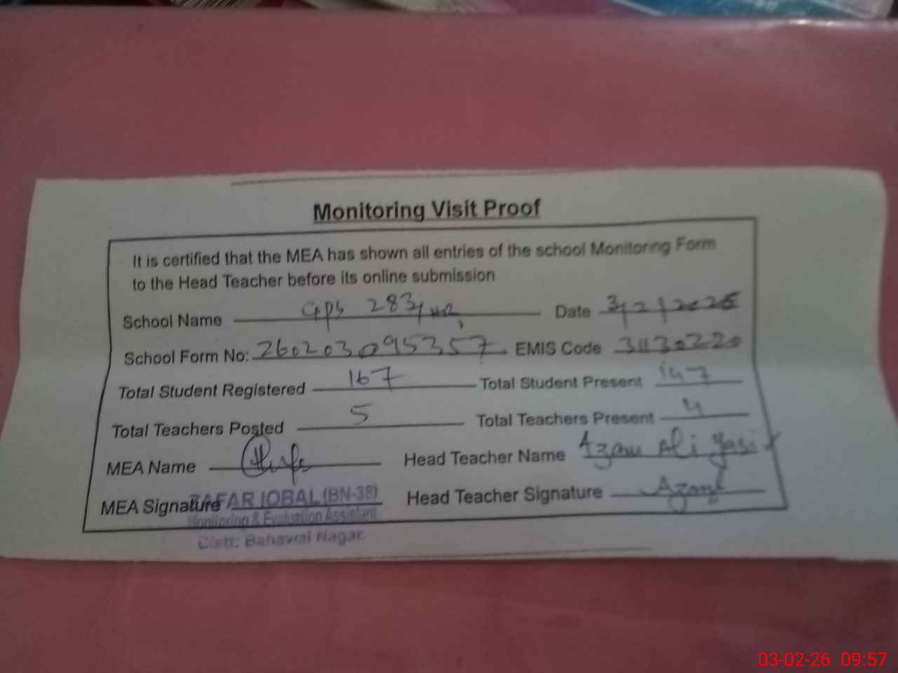 | EMIS Code: 31130220 | Name of School: GPS CHAK 283 HR | |||
