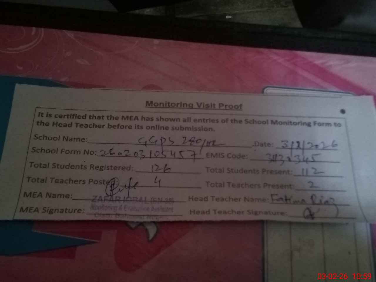 | Attendance Register | Head Teacher | MEA with School | Visit Proof |