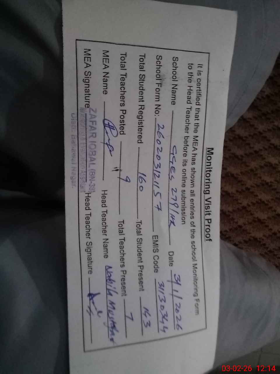 | Monitoring Date: 03-02-2026 | Start Time: 03-02-2026 11:43 AM | End Time: 03-02-2026 12:14 PM | Name of MEA: Za**** Iq**** BN**** | |