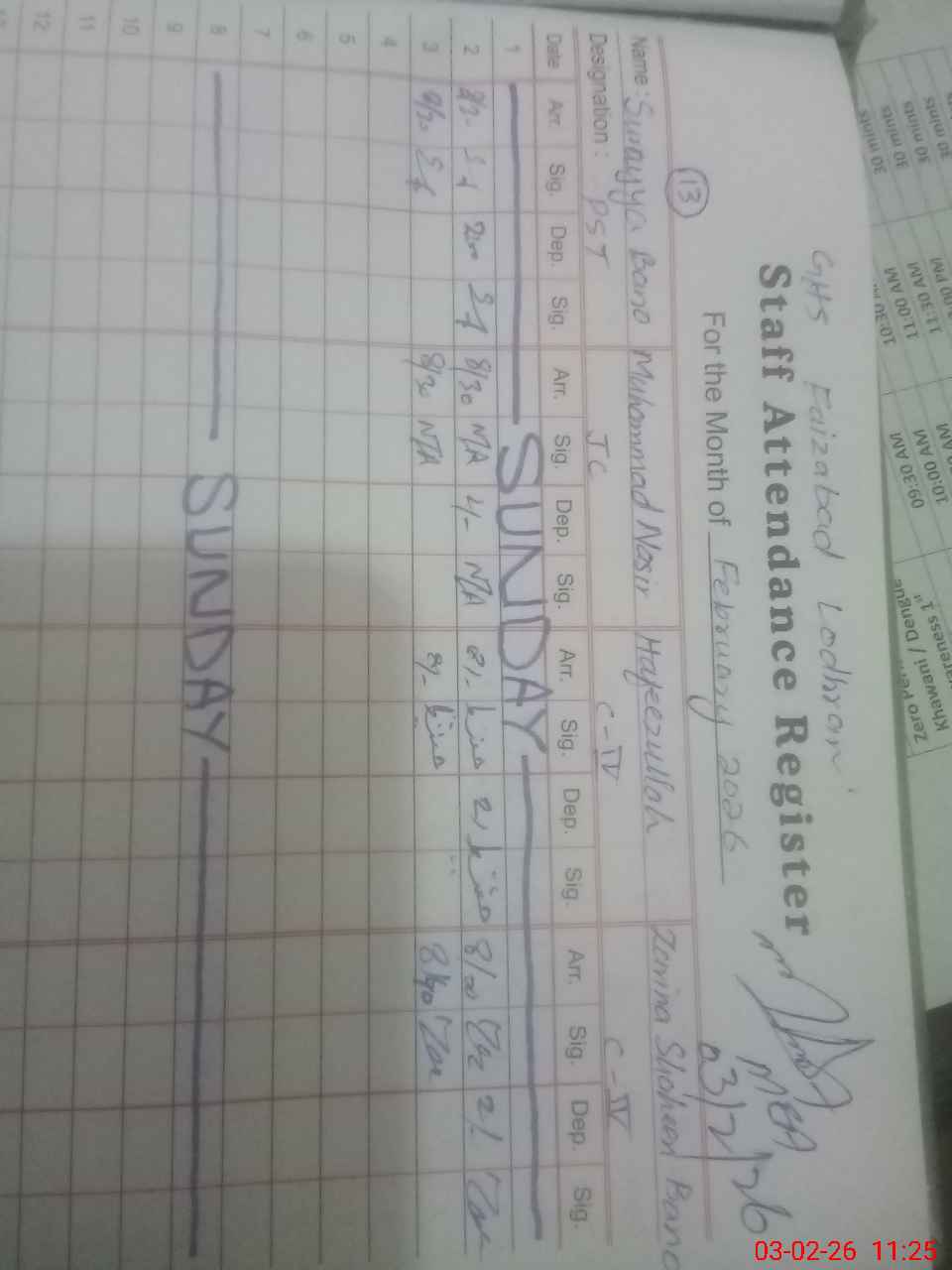 | CNIC | Full Name | Designation | R/C | Absence During Last Calender Month |