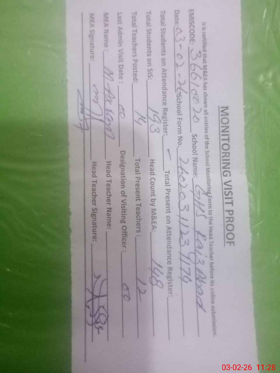 | Attendance Register | Head Teacher | MEA with School | Visit Proof |