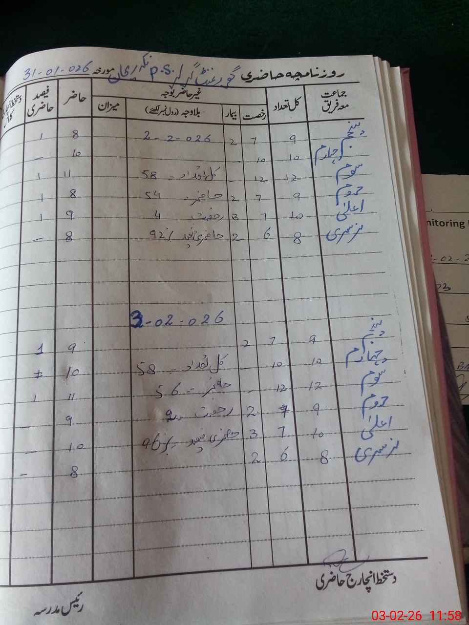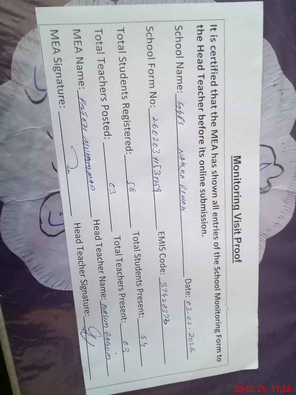 | Attendance Register | Head Teacher | MEA with School | Visit Proof |