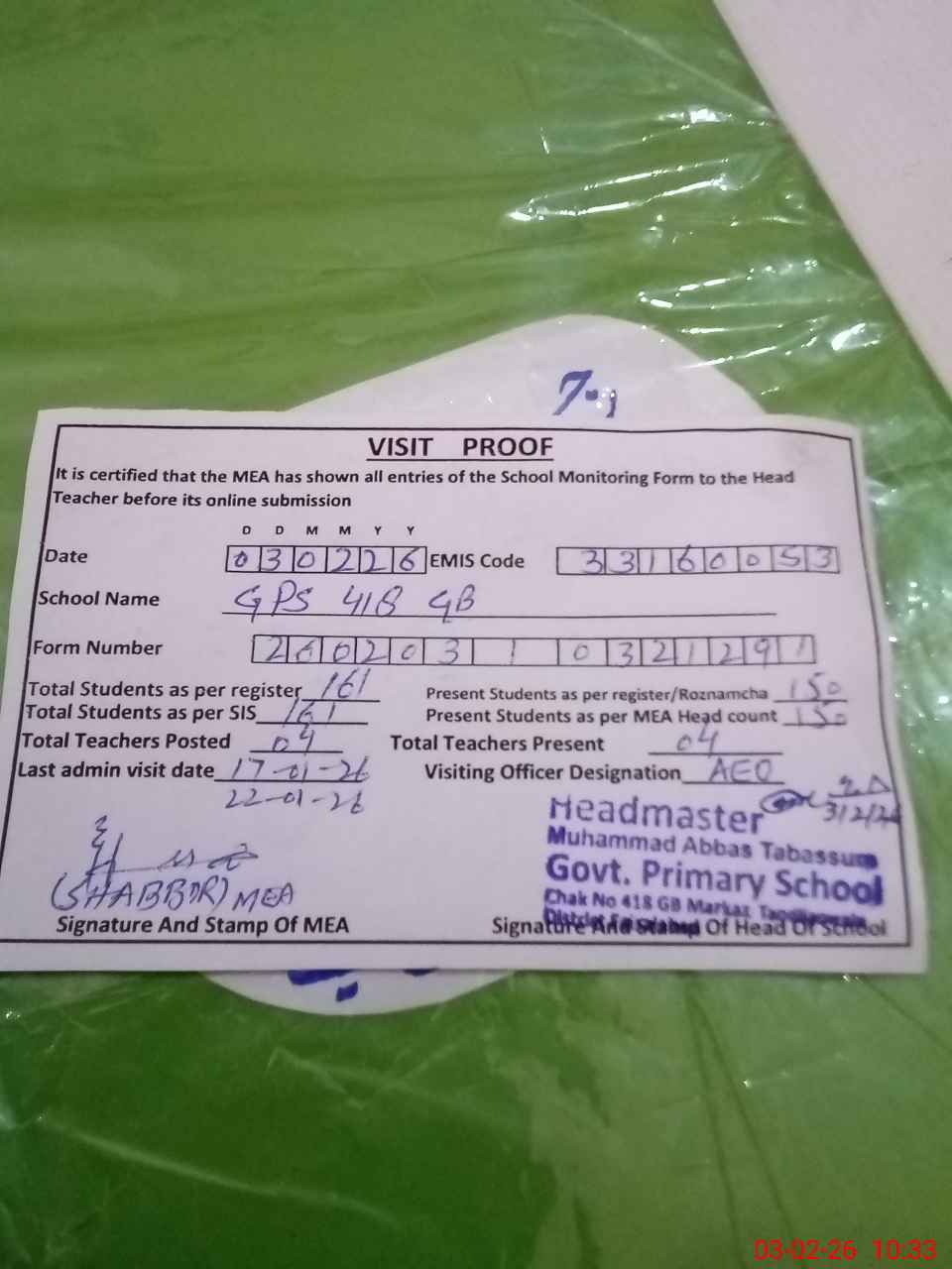 | Attendance Register | Head Teacher | MEA with School | Visit Proof |