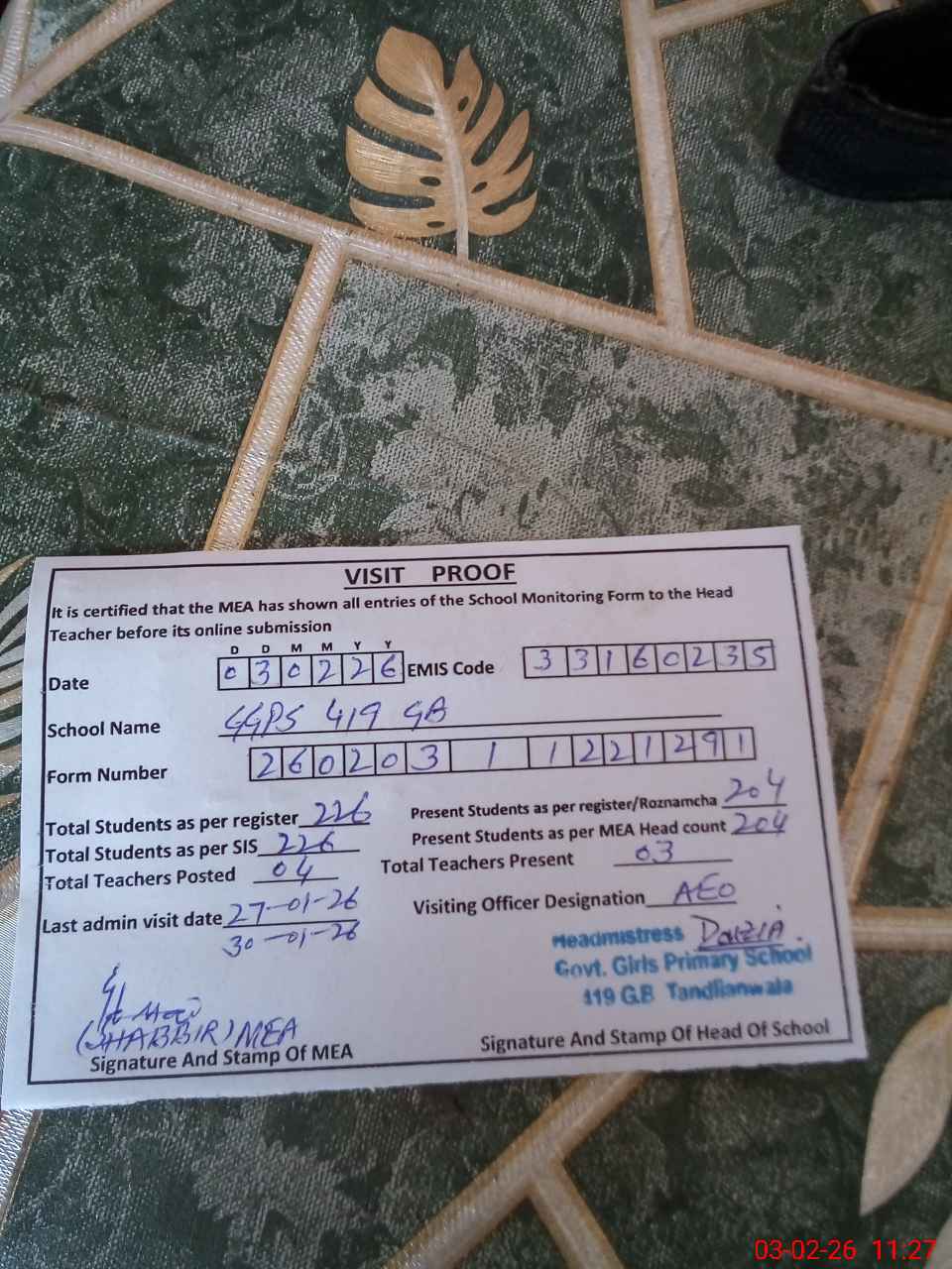 | EMIS Code: 33160235 | Name of School: GGPS CHAK 419 GB I TANDLIANWALA | |||
