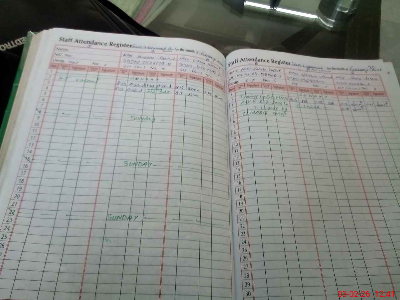 | CNIC | Full Name | Designation | R/C | Absence During Last Calender Month |
