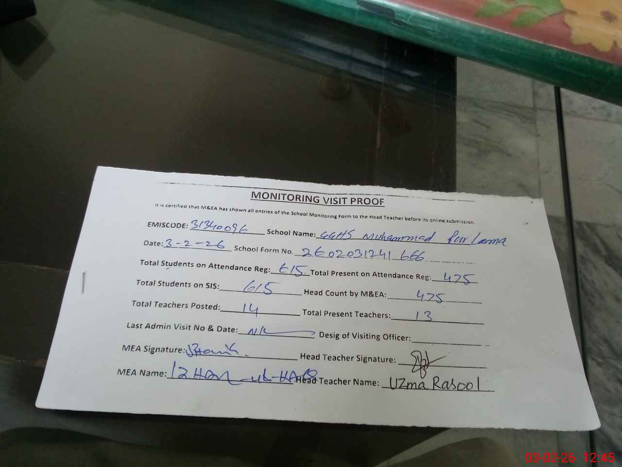 | Attendance Register | Head Teacher | MEA with School | Visit Proof |