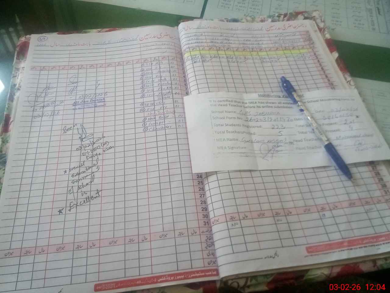 | Remarks (Use Separate Page if Required): last seen by Name Shahzad Fazal Designation DDEO Date 03 Feb 2026 | |||||