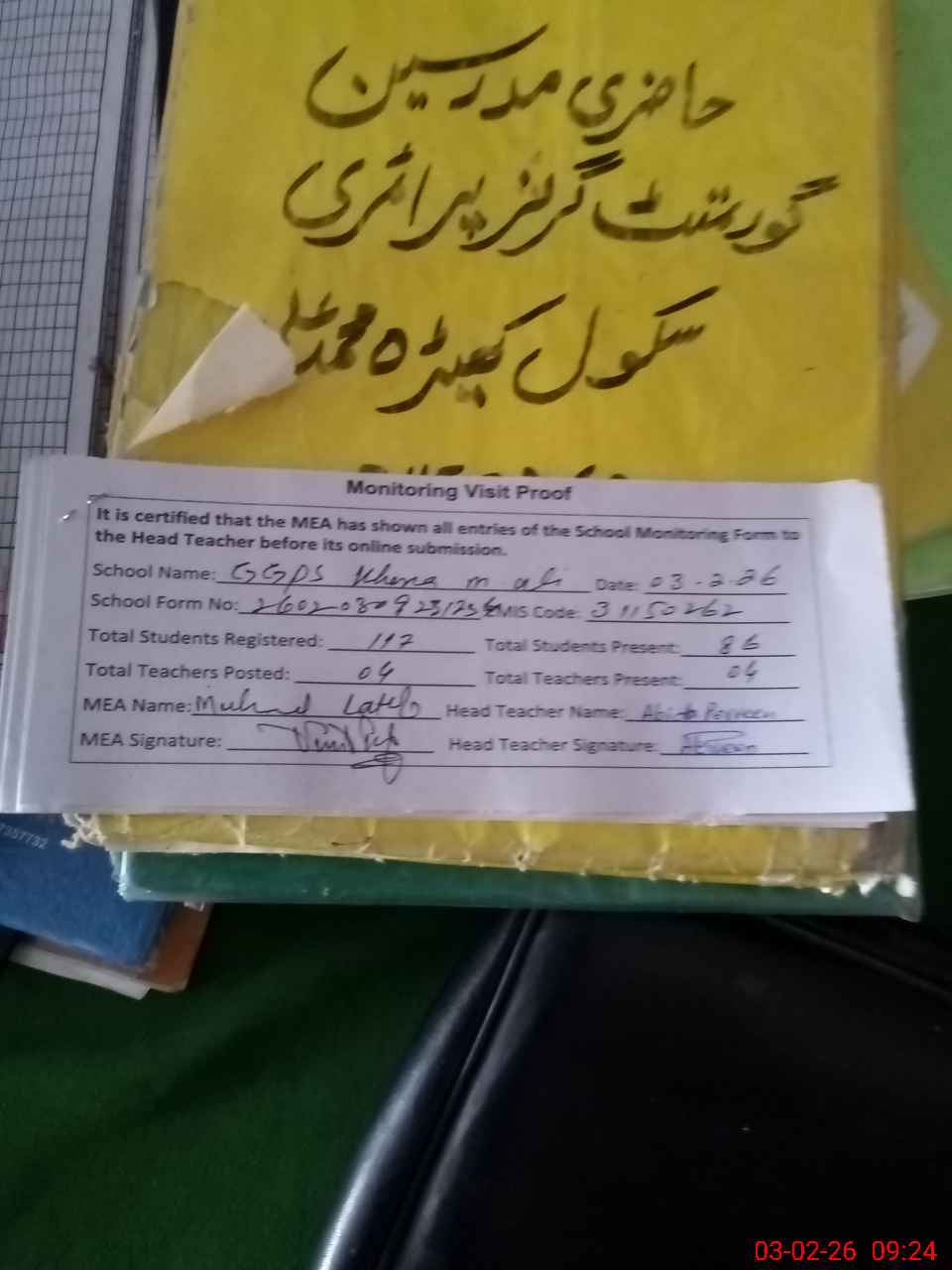 | Attendance Register | Head Teacher | MEA with School | Visit Proof |