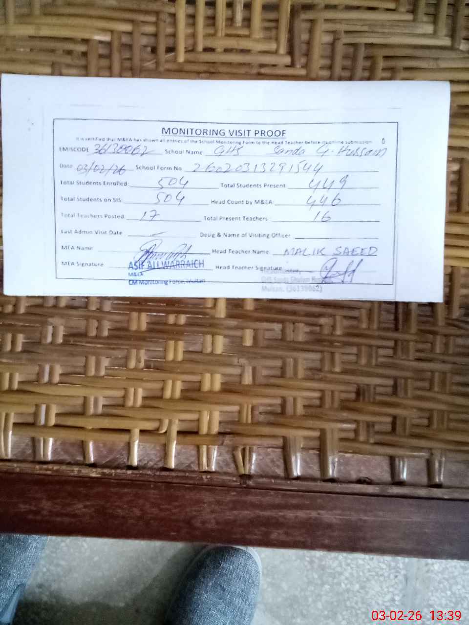 | Attendance Register | Head Teacher | MEA with School | Visit Proof |