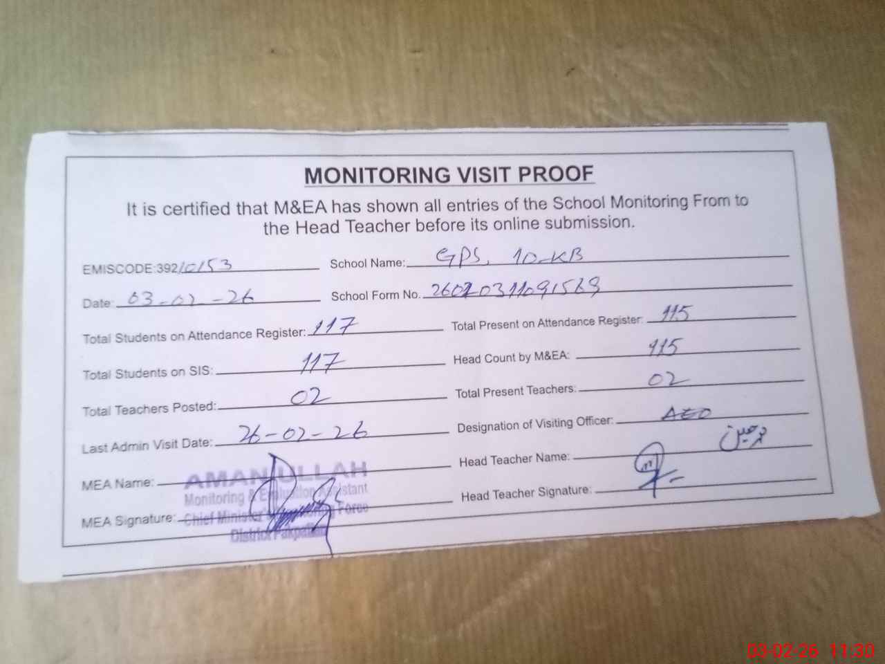 | Attendance Register | Head Teacher | MEA with School | Visit Proof |