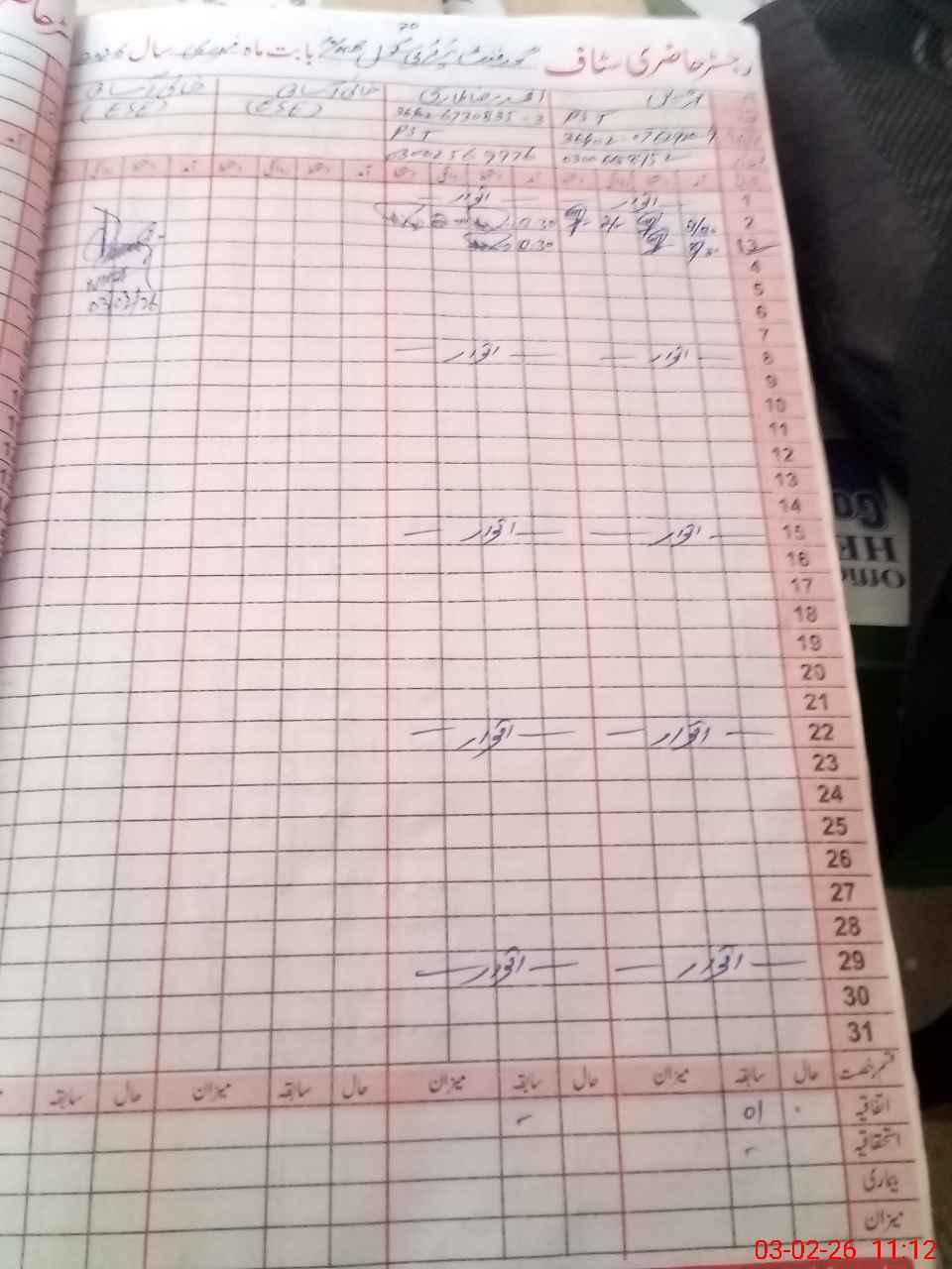 | CNIC | Full Name | Designation | R/C | Absence During Last Calender Month |