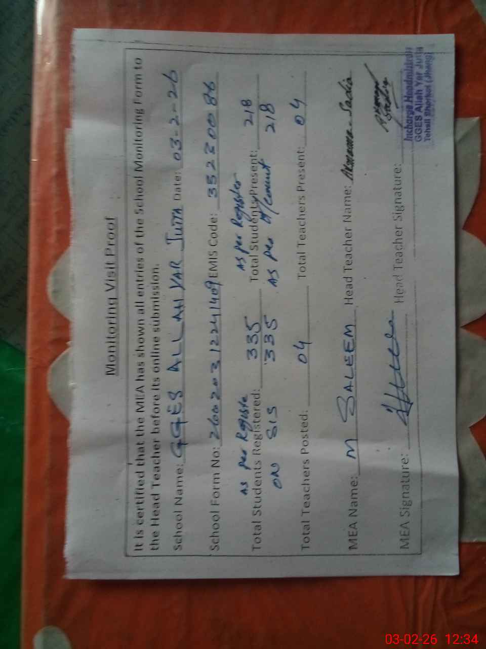 | Attendance Register | Head Teacher | MEA with School | Visit Proof |