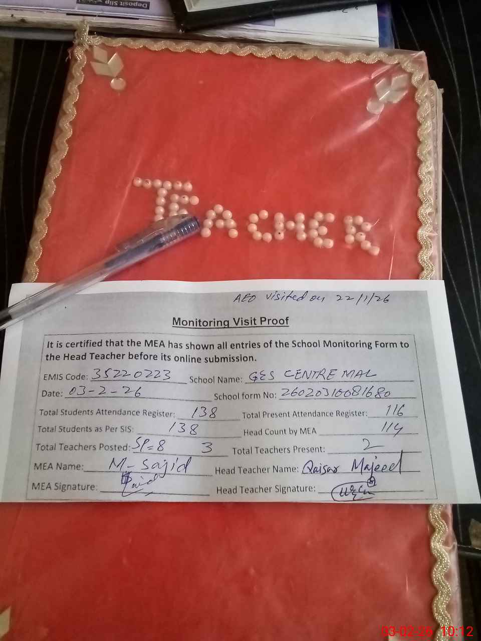| Attendance Register | Head Teacher | MEA with School | Visit Proof |