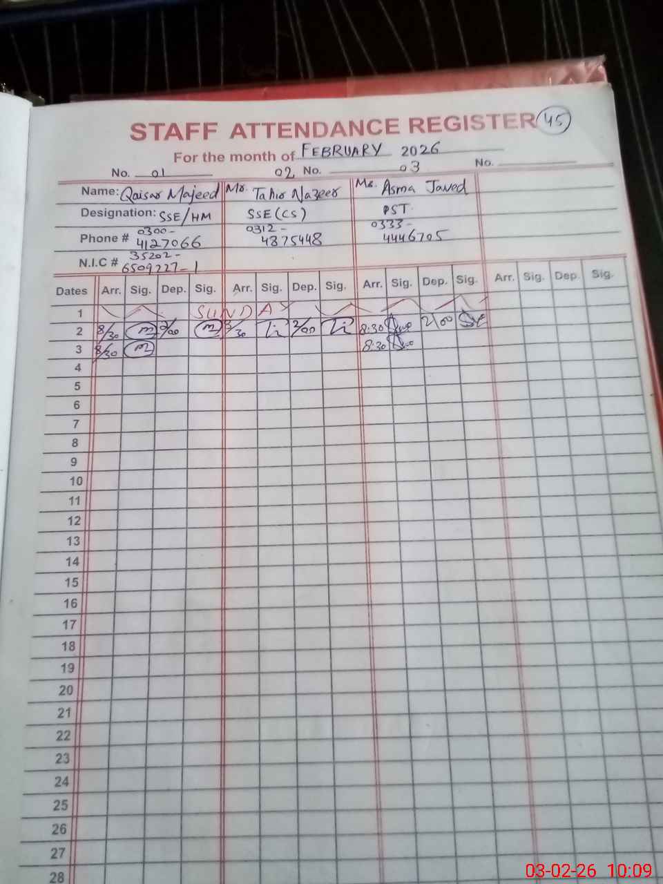 | CNIC | Full Name | Designation | R/C | Absence during last cal. month |
