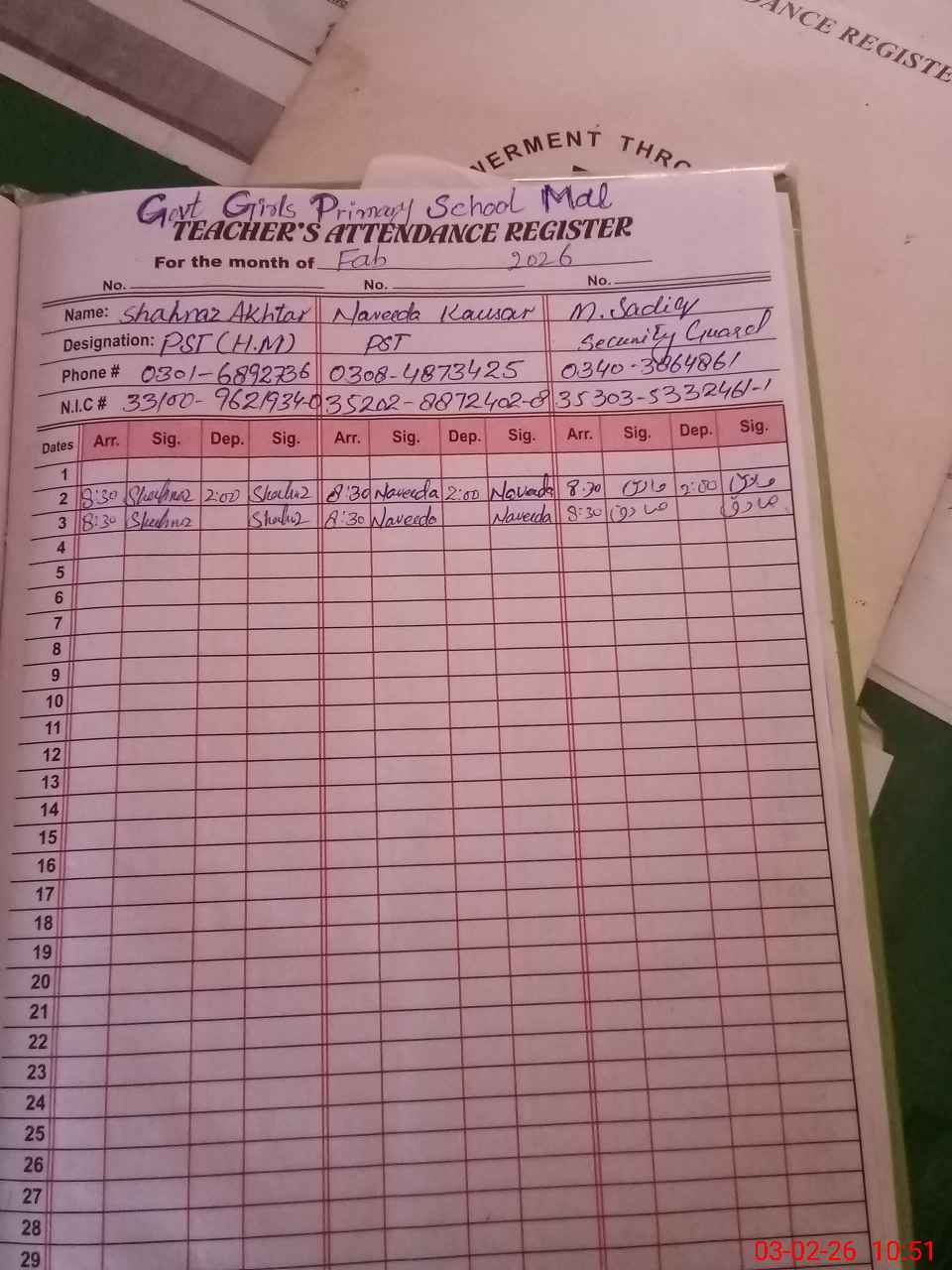 | Name: SH**** AK**** Designation: (School Headmaster's/Headmistress's) Head Mistress Phone/Cell Number: 03**** |