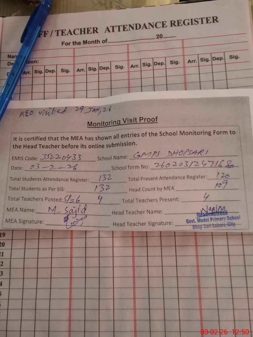 | Attendance Register | Head Teacher | MEA with School | Visit Proof |