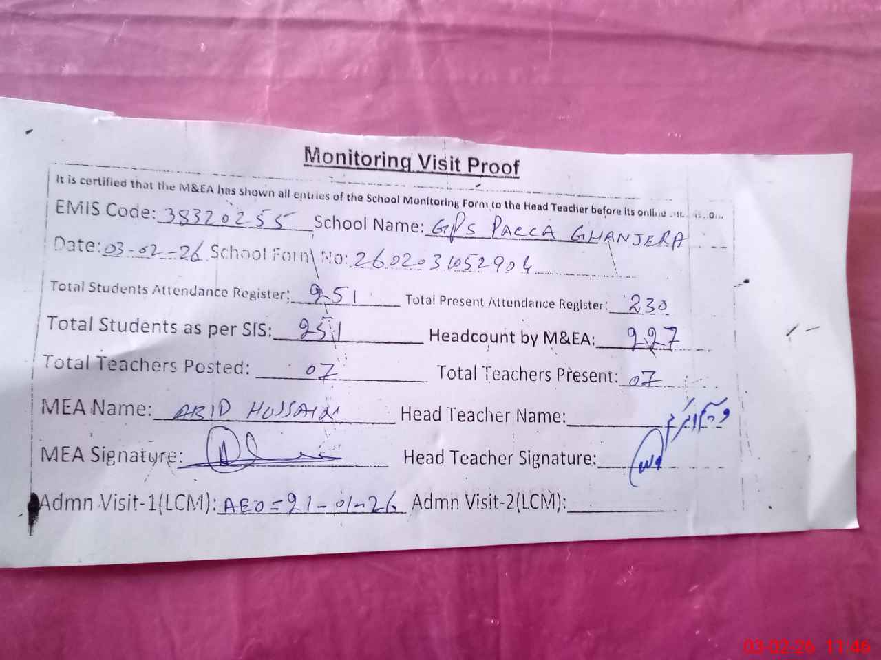 | EMIS Code: 38320255 | Name of School: GPS PACCA GHANJERA | |||