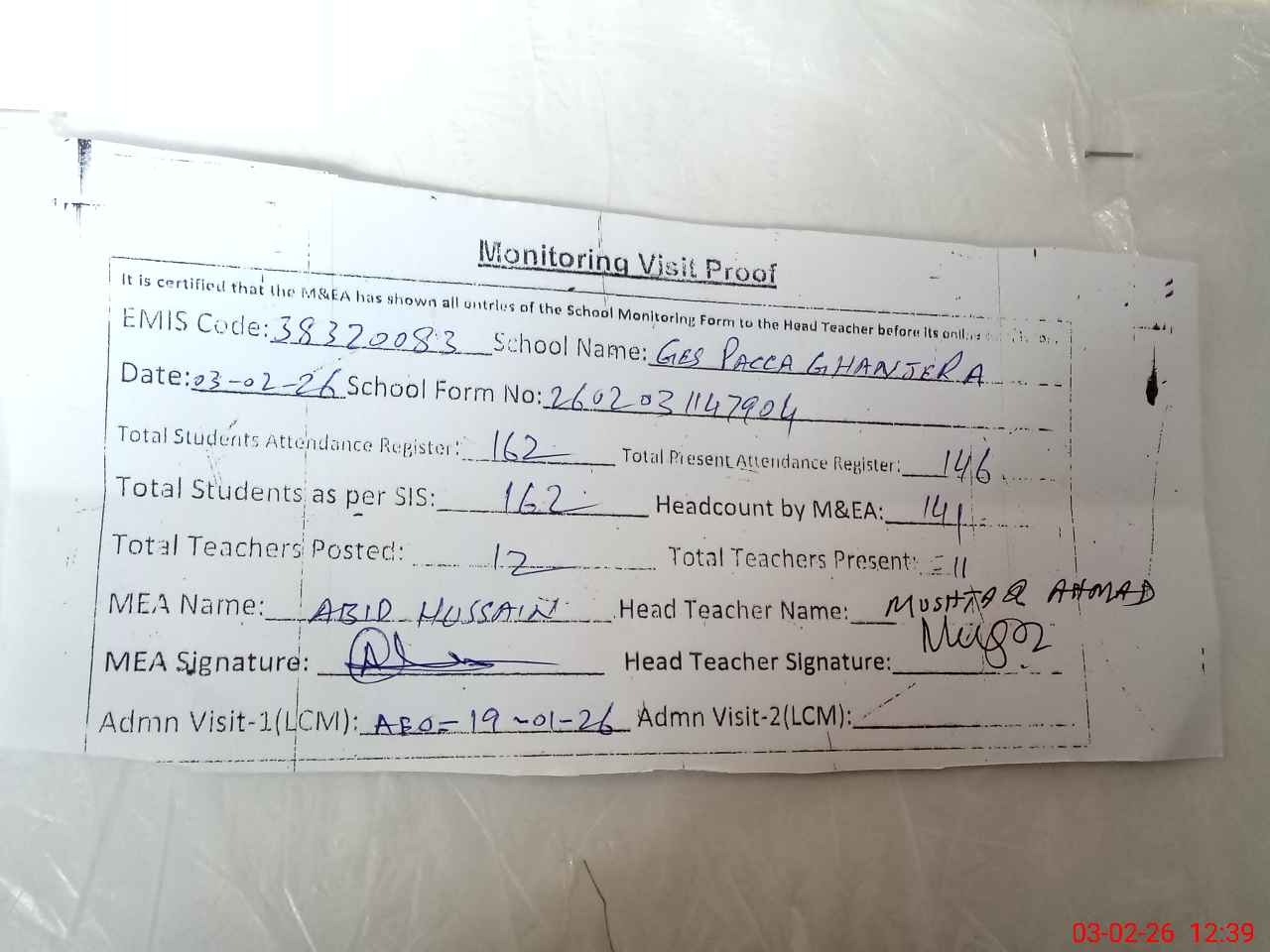 | Attendance Register | Head Teacher | MEA with School | Visit Proof |