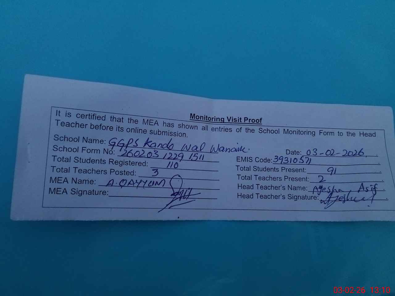 | Monitoring Date: 03-02-2026 | Start Time: 03-02-2026 12:29 PM | End Time: 03-02-2026 01:10 PM | Name of MEA: AB**** QA**** | |