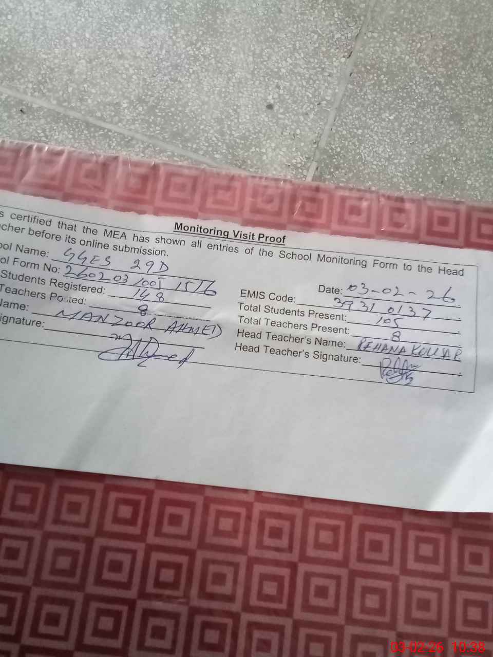 | Attendance Register | Head Teacher | MEA with School | Visit Proof |