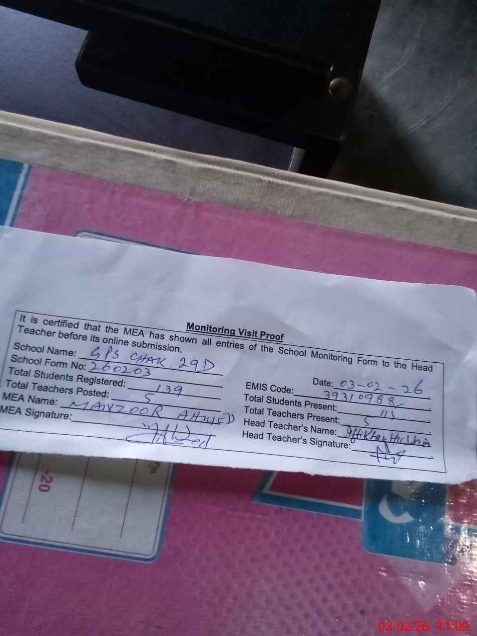 | Attendance Register | Head Teacher | MEA with School | Visit Proof |
