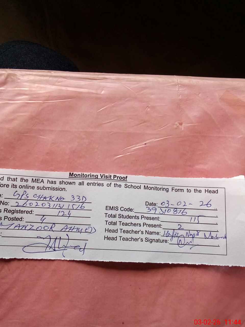 | Attendance Register | Head Teacher | MEA with School | Visit Proof |